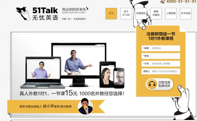 2011 年 7 月成立的 51Talk 到現在已經是國內規模最大的在線英語培訓學校之一,作為外教一對一的在線英語培訓,51Talk 一直走低價路線,因為師資主要來自菲律賓,所以它的課程價格差不多是線下培訓機構的 1/5。在 2011 年底,51Talk 曾獲得真格基金的天使投資,并在去年年底獲得 DCM 數百萬美元的 A 輪融資。而現在,51Talk正被期望成為“英語培訓領域的小米手機”。黃佳佳說他們和順為在理念上契合,認為體驗好的英語學習也可以是性價比高、便宜的,不會說得付幾萬塊才能學 ; 區別于傳統線下的教育培訓機構,51Talk 希望能提供給所有國人一個和外教學好英語的機會。順為基金里就有人在 51Talk 上學了半年。